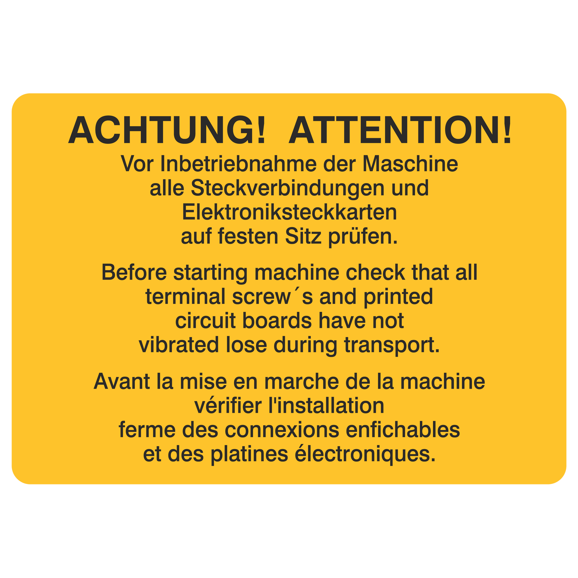 Achtung! Vor Inbetriebnahme der Maschine alle Steckverbindungen und Elektroniksteckkarten auf festen Sitz prüfen DE/ENG/FR