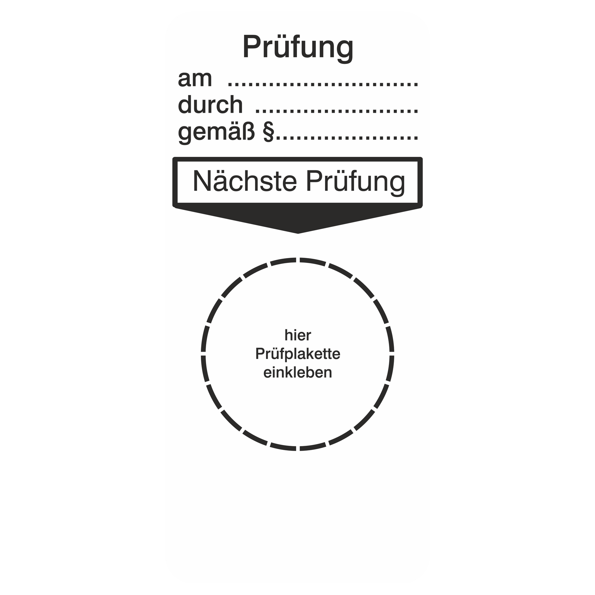 Text: Prüfung am ... durch ... gemäß § ... / Nächste Prüfung