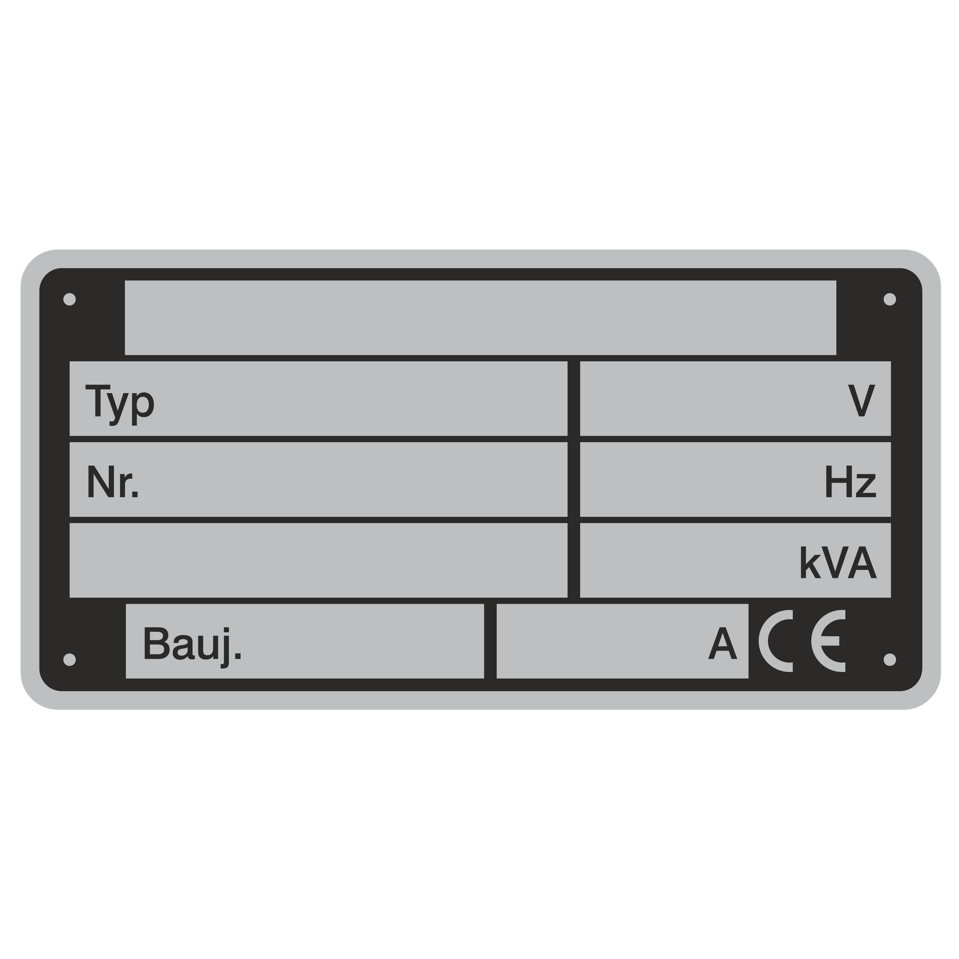Maschinenetikett / Typ_Baujahr_Nr_V_HZ_kVA_CE